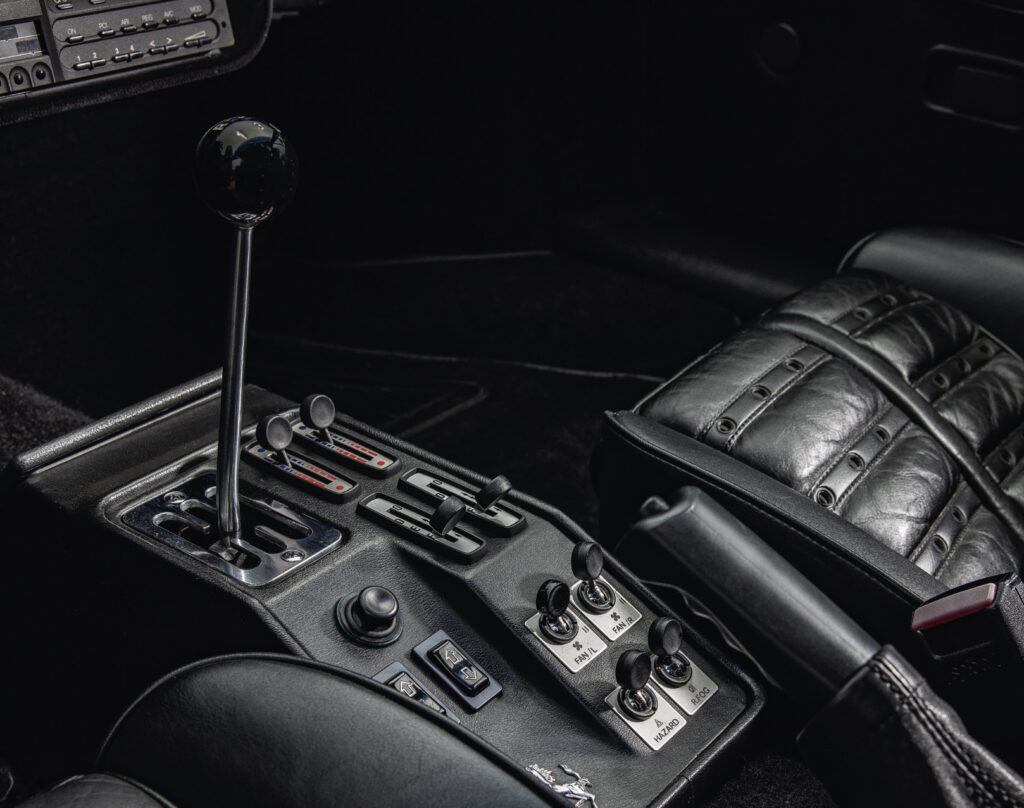 Aan de achterzijde van de achtcilinder zie je de transmissie laag tussen de achterwielen liggen, in lengterichting, wat niet alleen gunstiger is voor de wegligging maar het ook gemakkelijker maakt reparaties uit te voeren en de overbrengingsverhoudingen voor een bepaald circuit aan te passen. De motor, die parallel met Lancia’s Groep C LC2 krachtbron door Materazzi is ontwikkeld, levert met zijn 400 pk bij 7000 toeren veel meer vermogen dan die van de 308 GTB. Het maximum koppel van 496 Nm wordt bij 3800 toeren bereikt. Beide toerentallen duiden erop dat er een wachttijd is tot de turbo’s on song zijn, het zogenaamde ‘turbogat’. Zie dat als een verrassend goede reden om de motor hoog in de toeren te rijden. Er zitten veel koelsleuven in de motorkap, maar er blijft zoveel warmte onder hangen dat het voelbaar is door het met tapijt beklede schutbord achter je rug. De lijst met opties omvatte indertijd slechts airconditioning en elektrisch bedienbare ramen, beide aanwezig in ‘ons’ exemplaar.