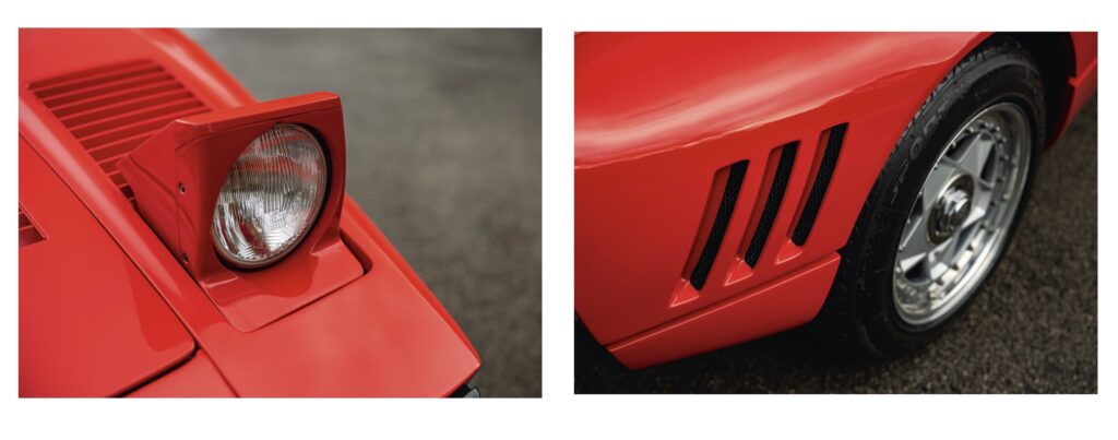 Als je hem en profil bekijkt kun je niet anders dan onder de indruk raken van zijn verleidelijke lijnen, de mooi gewelfde spatschermen en de ingesnoerde taille daartussen. De samengestelde 16-inch lichtmetalen wielen van Speedline – met centrale moer – zijn een schitterende finishing touch, evenals de drie sleuven achter zijn achterwielen – een knipoog naar de 250 GTO die vergelijkbare ‘uitgangen’ in zijn voorschermen had. De vormgeving is het werk van Leonardo Fioravanti, die toen voor Pininfarina werkte. “Het was de laatste Ferrari die ik persoonlijk heb ontworpen en begeleid”, vertelde de 86-jarige Fioravanti aan Octane in een e-mailbericht. Fioravanti omschrijft de 288 GTO als een ‘afgeleide’ van de 308. Het eerste werk aan het ontwerp werd uitgevoerd in de testafdeling in Maranello, niet in een ontwerpstudio. Het vertrekpunt was een onafgebouwd chassis van de 308, waarvan de wielbasis 110 millimeter was verlengd. De spoorbreedten waren ook vergroot en voor werden 8 inch brede wielen gemonteerd en achter 10 inch.