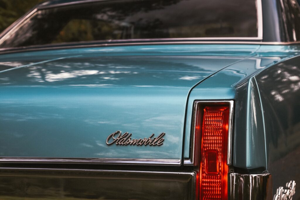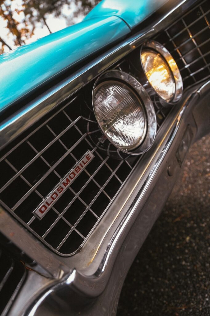 Terwijl we samen voorzichtig de hoes van de auto halen vertelt ze verder. “Het is zo’n mooie auto, ook deze heeft weer die mooie, wel hoekige, coke-bottle lijn als je de flanken van voor naar achteren volgt. Als extra heeft deze Olds een scherpe verticale lijn in het achterscherm, dat zorgt net voor wat extra spanning in het ontwerp. Zo mooi! Ik ben helemaal weg van die vormen en heb daar meer mee dan met de techniek, ook al heeft deze Oldsmobile een bijzondere motor.”