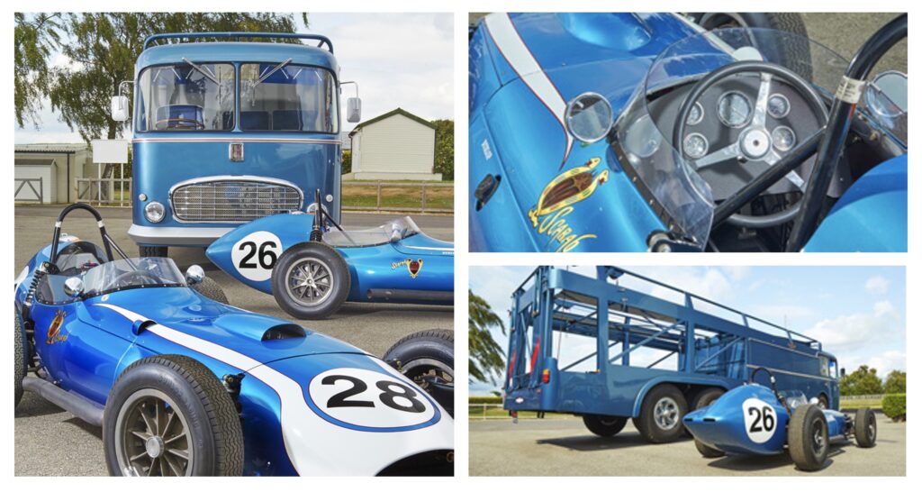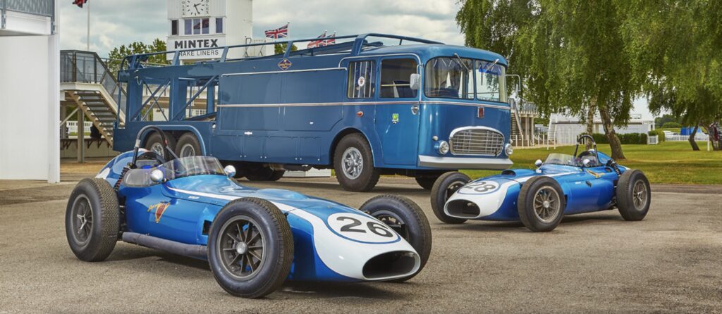 De vrachtwagen die achter de twee Scarabs staat, lijkt slechts een bijrol in dit verhaal te hebben, maar vergis je niet, hij was ooit een filmster. Het is ook een bijzondere truck, bestemd voor het vervoer van raceauto’s, uit de tijd dat transporters zoals hij nog speciaal voor dat doel werden gemaakt. Het hedendaagse rollend materieel van de F1 bestaat uit gesloten vrachtwagens, met geavanceerde mobiele machinewerkplaatsen aan boord of hoogontwikkelde strijdrossen van race-ingenieurs. Ze zijn dikwijls alleen herkenbaar aan hun teambeschildering, zonder dat zouden ze net zo goed vol kunnen staan met wasmachines of dozen vol laarzen.