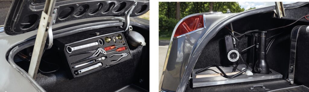 In de kofferbak bevinden zich ook het reservewiel, een set gereedschap, de techniek van de elektrische antenne en de 100-liter benzinetank – met racesluiting. Ondanks het formaat van de Facel is er niet eens zo heel veel ruimte voor bagage achterin, maar er is dan altijd nog de achterbank om tassen en koffers te parkeren. Facel leverde desgewenst een set leren riemen om die last te verankeren. Met die grote tank, die zo dicht mogelijk bij de starre achteras ligt, moet je blij zijn. Het gemiddelde verbruik was – tijdens het verblijf bij ‘The Motor’ – zo’n 1 op 5. Tijdens normaal gebruik zal dat iets gunstiger uitpakken, maar toch doe je er goed aan om na uiterlijk 400 kilometer een tankstation op te zoeken.