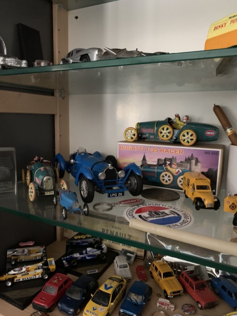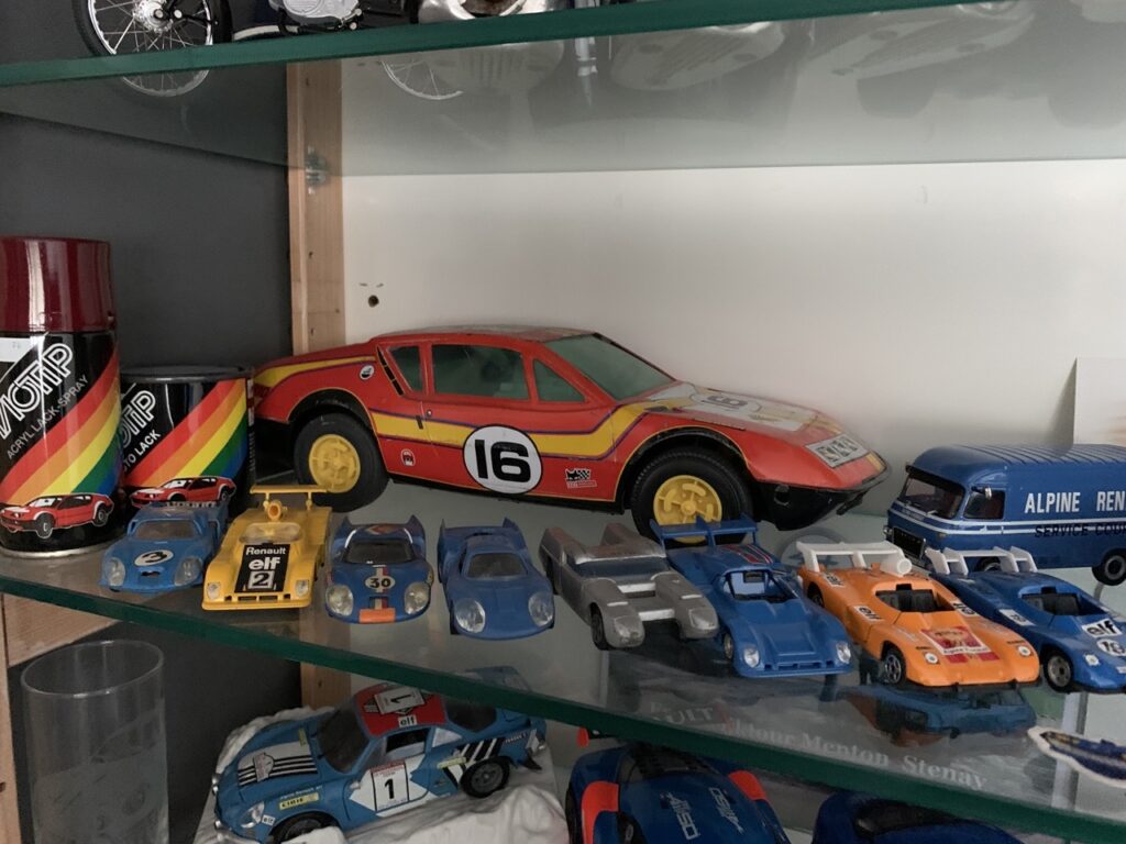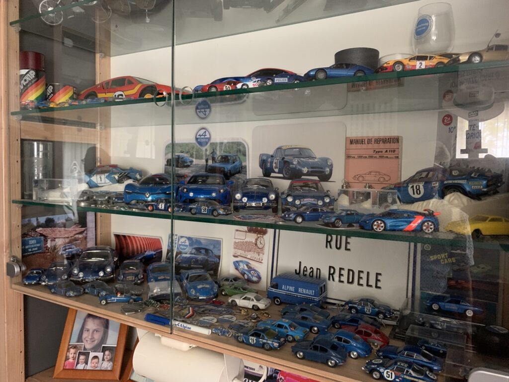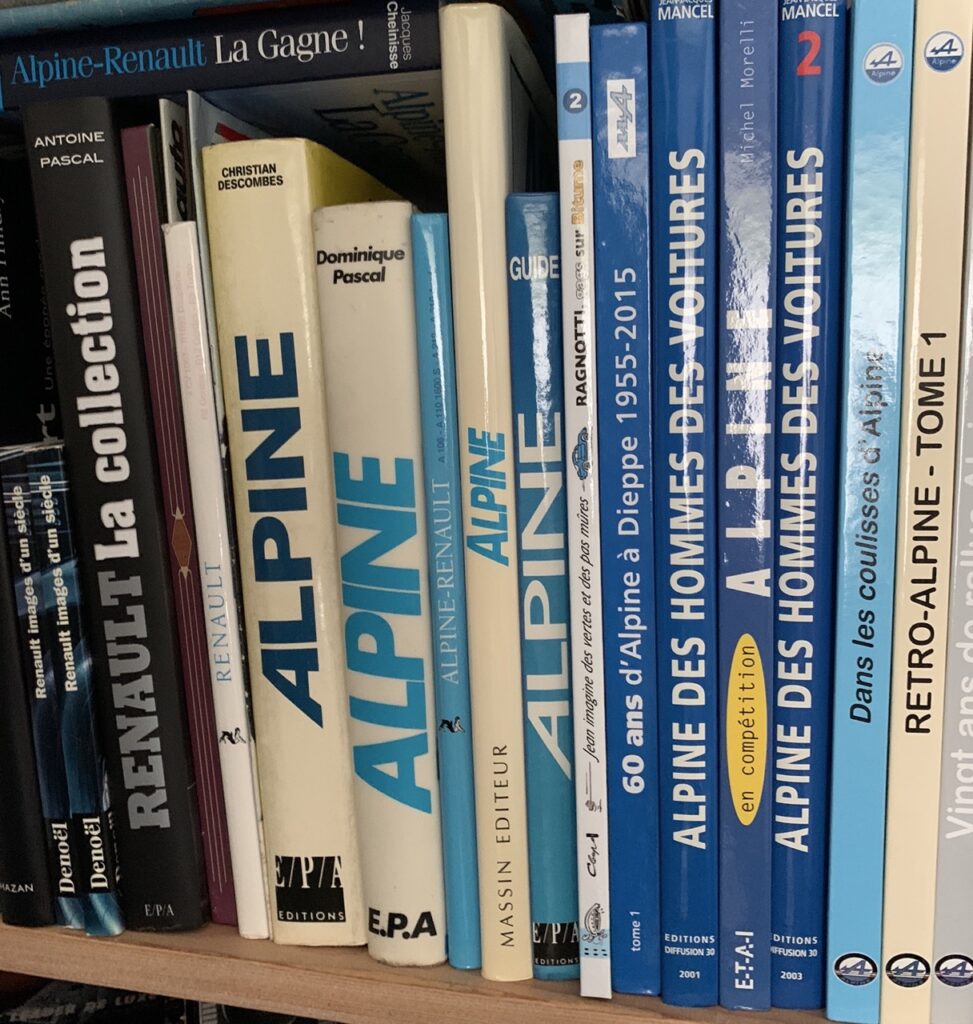 Voordat we naar de auto’s gaan, laat Domien nog graag zijn ‘archief’ zien, een kamer in zijn huis waar hij naast zijn schilderkunst ruimte heeft voor een grote verzameling modelauto’s en autoboeken. Het merk Alpine is vanzelfsprekend zwaar vertegenwoordigd, tot en met het originele werkplaatsboek aan toe. “Er zitten best zeldzame autootjes tussen maar de verzameling is voor mij zo wel compleet genoeg. Naast Alpine ben ik ook een liefhebber van de Franse automerken Amilcar en Salmson. Over Amilcar heb ik een mooi groot overzichtsboek.”