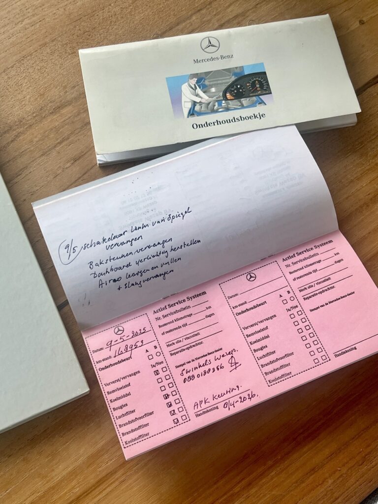 Het onderhoud is altijd keurig door een dealer of specialist uitgevoerd en zelfs de isolatie van de motorkap is recent nog vernieuwd. Net voordat de auto in bezit van Frank kwam heeft de vorige eigenaar nog een onderhoudsbeurt laten uitvoeren, waarbij een spiegelschakelaar en de versnellingsbaksteunen zijn vervangen, de dashboardverlichting is hersteld en de airconditioning gevuld en nagelopen is. Een duidelijk bewijs van de liefde voor de Benz en natuurlijk nauwkeurig vastgelegd in het tweede originele onderhoudsboekje dat hij bij de dealer had opgehaald omdat het eerste vol was.
