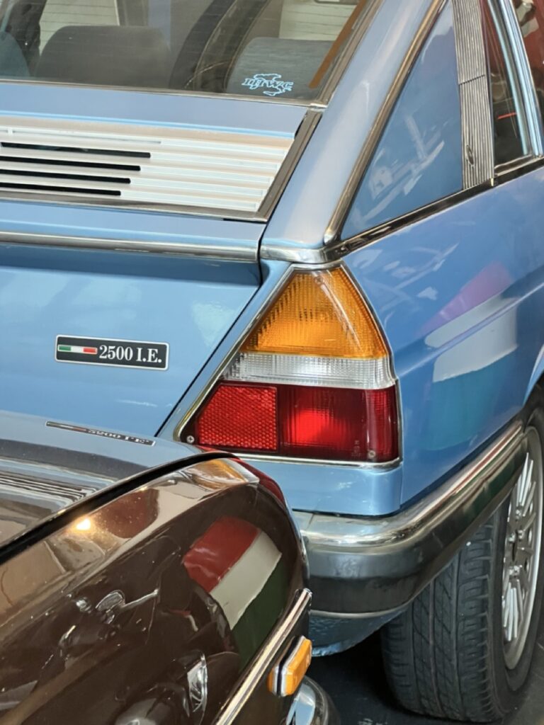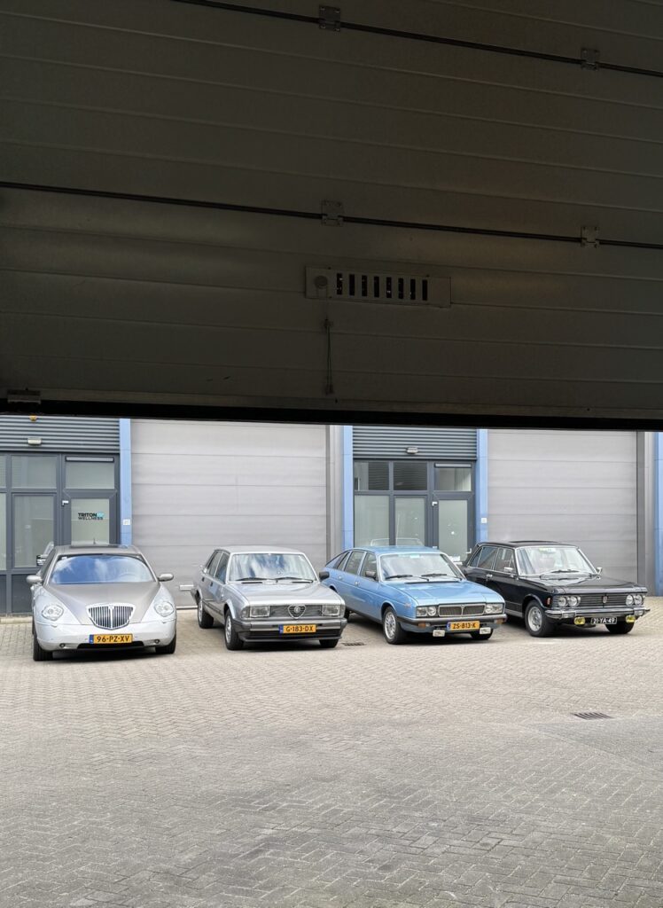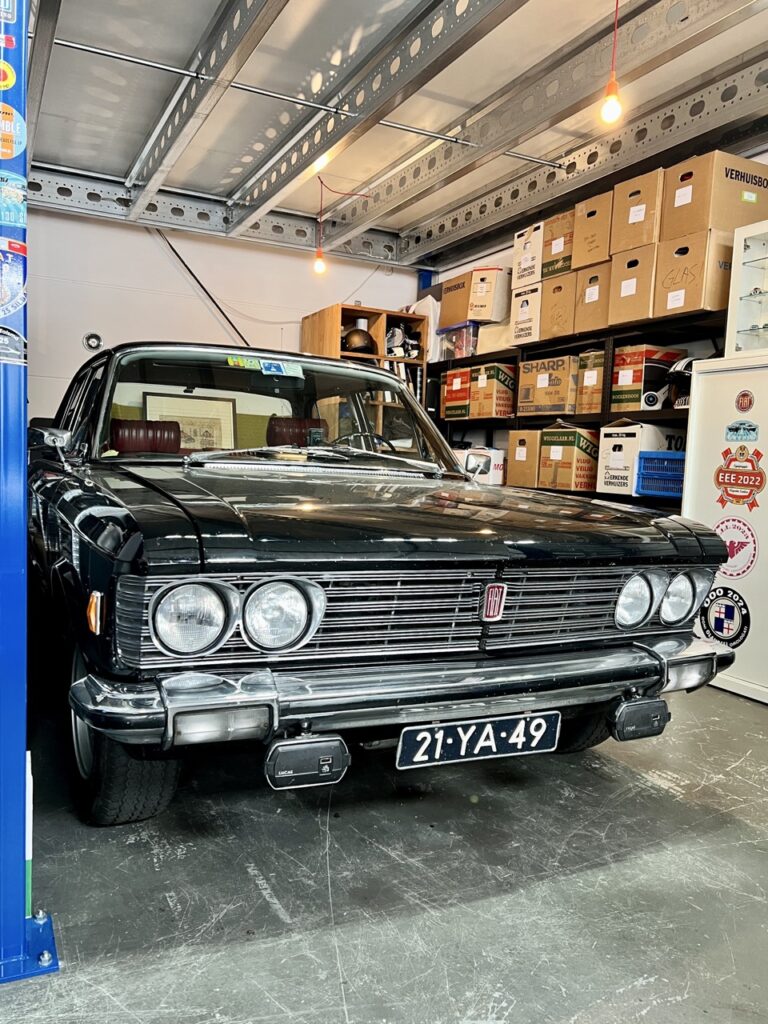 In de verste hoek staat de machtige Fiat 130, een grote zescilinder sedan. Er zijn maar weinig mensen die het merk Fiat nog in verband brengen met grote auto’s, maar de 130 is er zeker een. Een auto die je je zo kunt voorstellen, geparkeerd voor een statig kantoorgebouw in Rome of Turijn, met een chauffeur die wacht tot Gianni Agnelli op de achterbank plaats zal nemen.