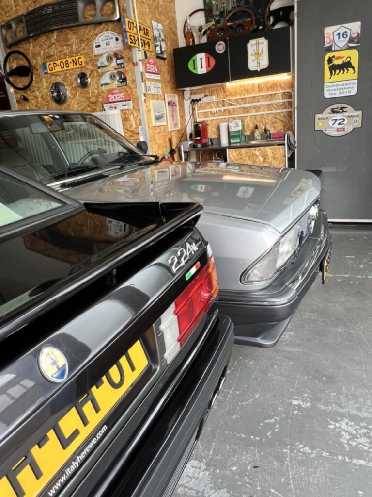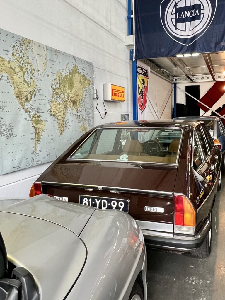 Aan de wand hangen vlaggen met merkemblemen van Lancia en Fiat, een lichtreclame van Agip en er staan rekken met reserveonderdelen, miniatuurauto’s en een paar flessen wijn met ‘Lancia’ op het etiket. Een tafel met goede stoelen en een koffiemachine maken deze ruimte tot een ‘cave’.