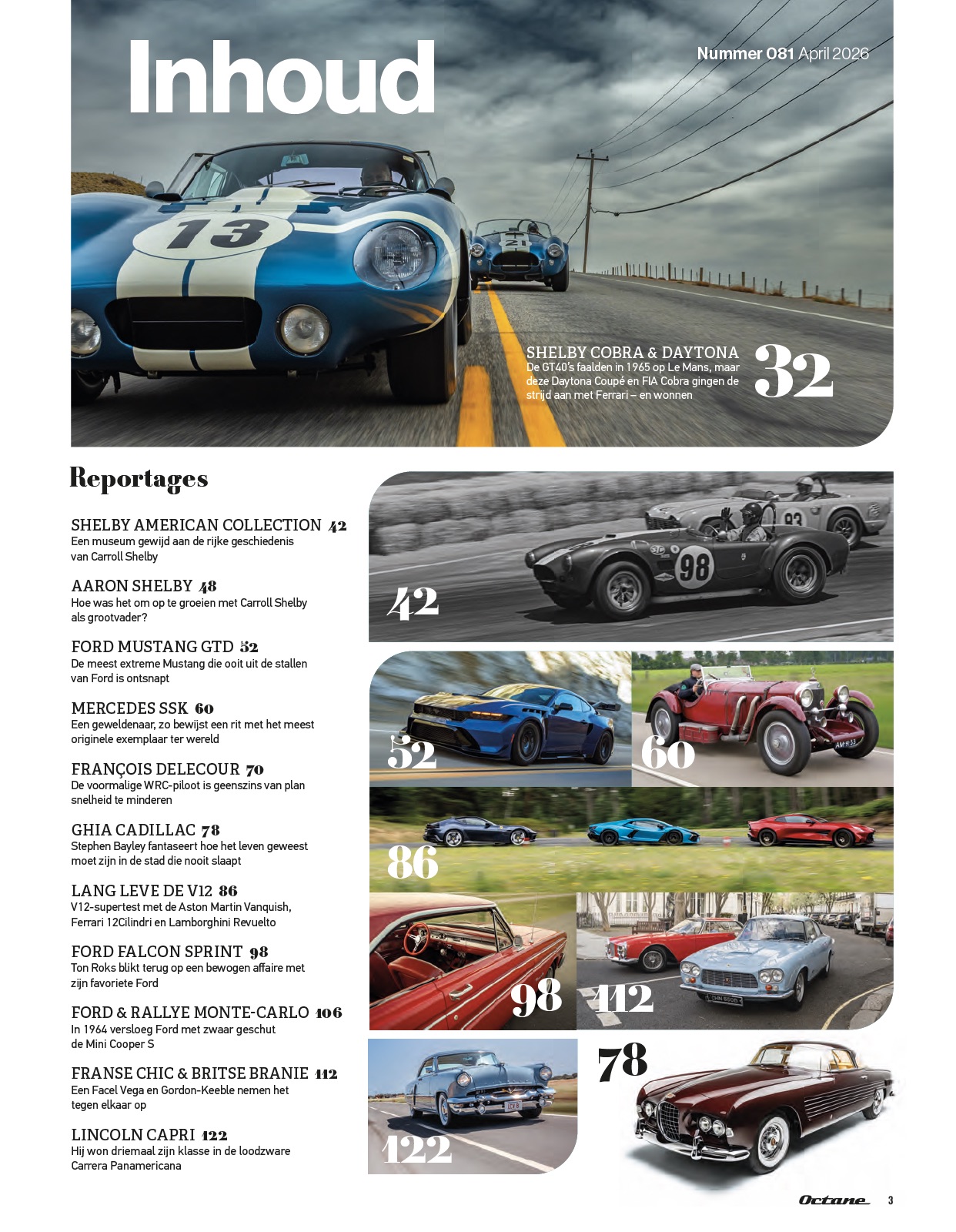 Een dik aantal pagina’s zijn gevuld met een Shelby Special over de Cobra en Daytona, het Shelby Museum en de kleinzoon Aaron Shelby die het familiemerk in leven houdt. Daarnaast is de kortstondige affaire van Ton Roks met zijn Ford Falcon Sprint de inleiding tot de rol die de grote Ford’s speelden in de Rallye Monte Carlo. En om het Amerikaanse feest compleet te maken rijden we met de Ghia Cadillac, die Italiaanse stijl combineert met Amerikaanse overdaad. Met de GTD is de meest extreme Mustang ooit uit de stallen van Ford ontsnapt en uit het verleden komt de Lincoln Capri die drie keer de zware Panamericana rally in zijn klasse won.