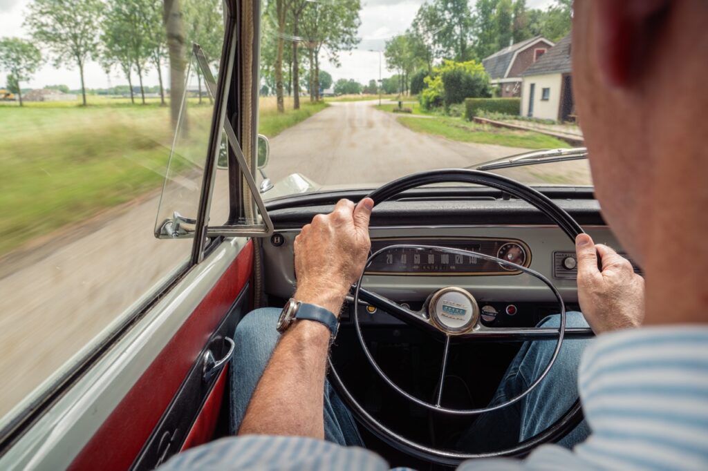 De met rood skai beklede stoelen van de Caravan, zonder hoofdsteunen, zitten prima, al is de ruimte tussen rugleuning en stuur wat krap. Dat went snel en hij laat het asfalt rondom Buren comfortabel en in een goed tempo onder zijn wielen doorrollen. Hij is dan ook een ‘S’ die 8 pk meer aan boord heeft dan normaal. Volgens Johan werd de S-motorvariant alleen voor export naar de VS in de Caravan geleverd. Ondanks die extra pk’s lijkt het een fikse uitdaging met deze Kadett op vakantie naar Zuid-Frankrijk te gaan, dat was toen echter de gewoonste zaak van de wereld. Leuk detail is dat de marketingmensen van Opel indertijd grote nadruk legden op het feit dat de vulopening voor de tank zich aan de buitenkant van de carrosserie bevond. Bij de Kever moest je daarvoor de bagageruimte in, het voordeel was dat de bagage in de Opel niet naar benzine rook.