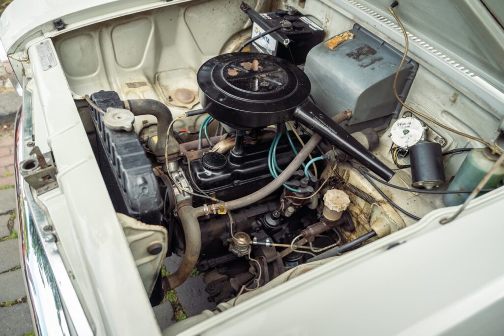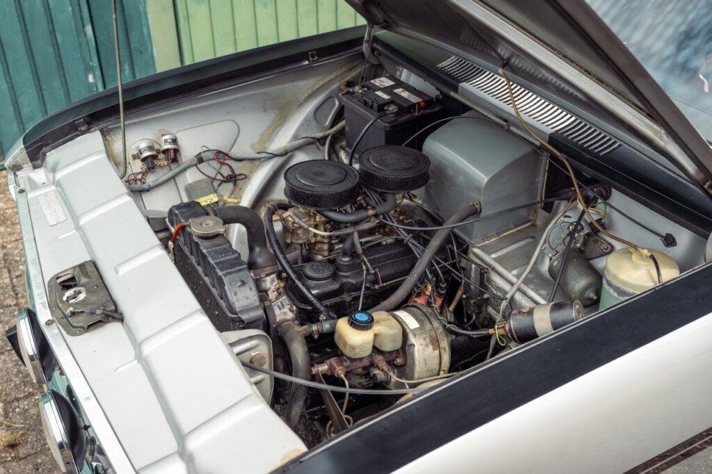 De 1,1-liter viercilinder van de coupé is voorzien van twee Solex carburateurs met elk een eigen luchtfilter, wat een bijzonder gezicht is. Hij levert 60 pk, wat in die tijd een aardig vermogen was en met een leeggewicht van slechts 783 kg was de pk-gewichtsverhouding 13 kg/pk. Dat bracht de achterwielaangedreven auto naar een topsnelheid van 148 km/h, maar je moest wel 16,5 seconden geduld hebben om vanuit stilstand naar 100 km/h te komen. De motor was weliswaar voorzien van bovenliggende kleppen, maar die werden nog met stoterstangen door een onderliggende nokkenas bediend. De ‘B’ had schijfremmen, echter alleen op de vooras.