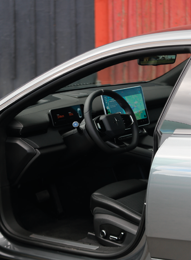 Uit handen van Joakim krijg ik de sleutel in handen gedrukt, of beter gezegd het kleine contactkastje. De eerste indruk van de 4 is een beetje verwarrend. Dit is geen SUV, geen coupé, geen sedan. Het is iets ertussenin, een crossover-coupé met vier portieren die een eigen categorie lijkt op te eisen. Breed is hij ook, hij staat gespierd op zijn wielen. De stance is goed. De uitstraling ook: geen schreeuwerige lijnen of nutteloze openingen of roosters, alles heeft een functie. De lijnvoering lijkt op die van zustermerk Volvo, zonder dat het ook maar ergens hetzelfde is. De afwezigheid van een achterruit onderstreept dat Polestar durft te breken met conventies, ‘wij kijken niet achterom’, Polestar is geen ‘volger’.