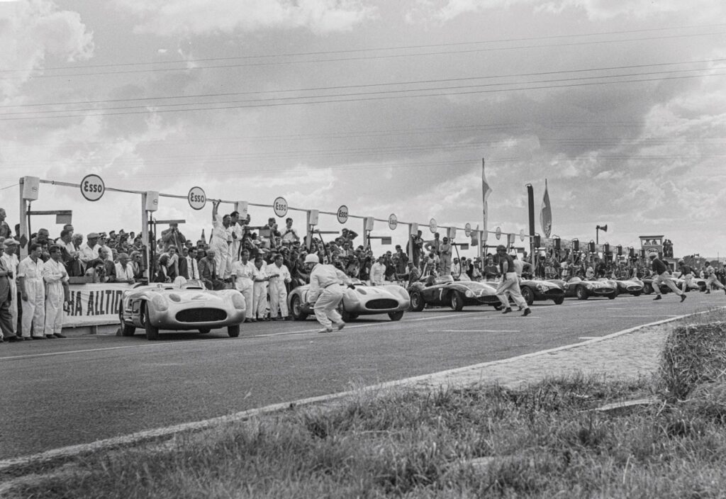 Precies 70 jaar geleden raasde Fangio hier op zijn overwinning af, met snelheden die zelfs vandaag de dag nog duizelingwekkend zijn. Zijn 300 SLR kon 290 tot 300 km/h halen en op dit lange rechte stuk zal hij daar een heel eind bij in de buurt zijn gekomen.